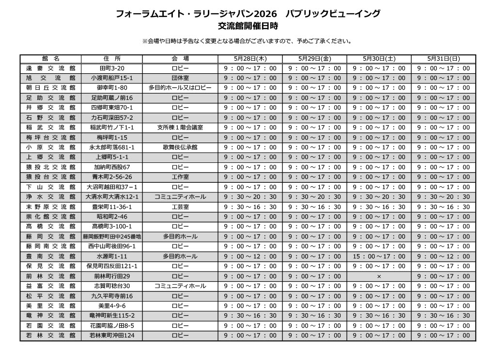 | 日にち | 施設名 | 会場住所 | 開催時間 |
