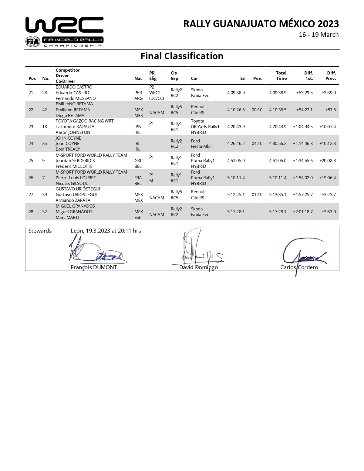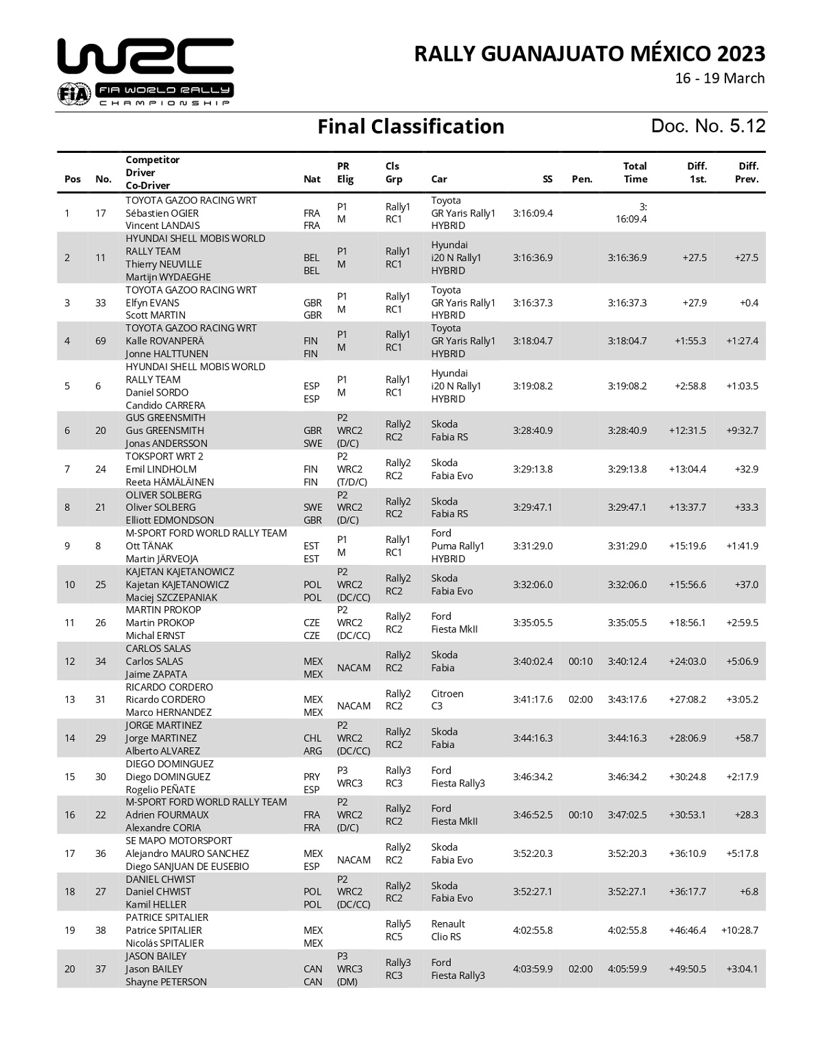 ティエリー・ヌービル(ヒョンデi20 Nラリー1)とエルフィン・エバンス(トヨタGRヤリス・ラリー1)は最終パワーステージまで緊迫した2位争いを繰り広げたが、最終的にわずか3.3秒差でヌービルが2位を獲得した。