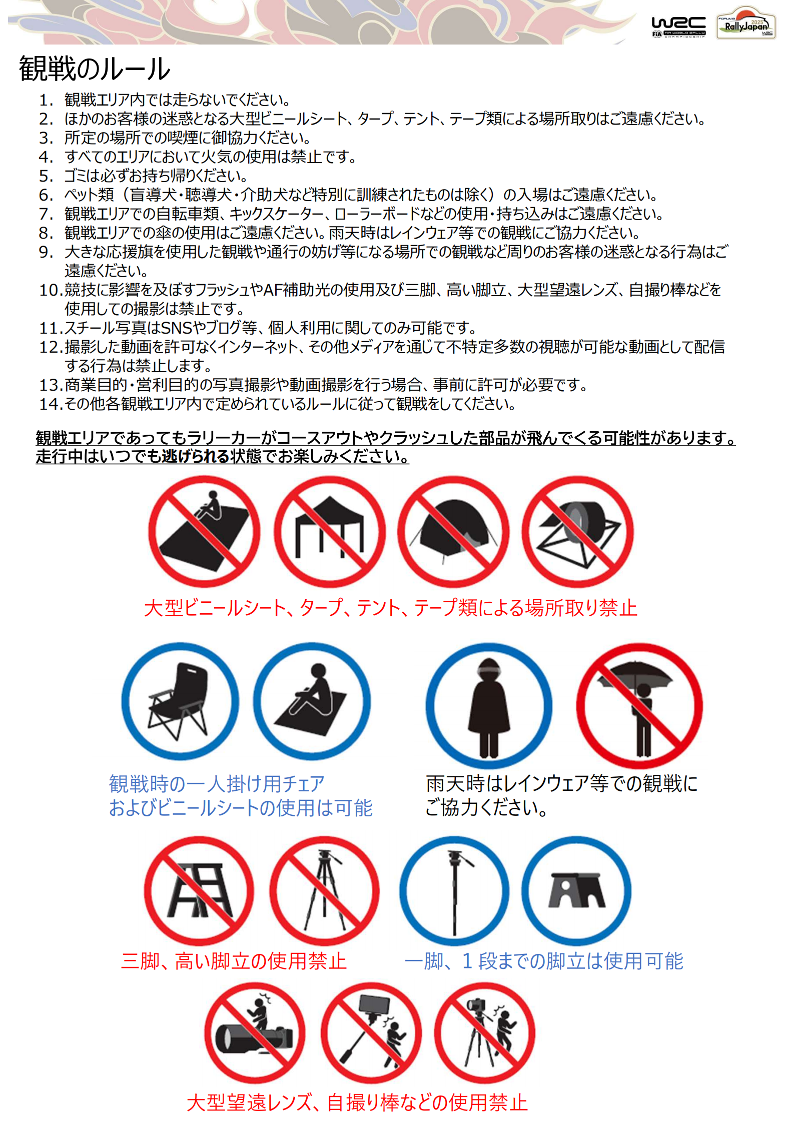 モータースポーツには危険が伴います。安全性の確保については必要な対策を施しておりますが、予想できない事故が発生する場合があります。これら発生しうるリスクのすべてについては自己責任となり、オーガナイザー、後援者、協力者、係員、ならびにRally Japan実行委員会では一切の責任を負いませんのでご了承ください。