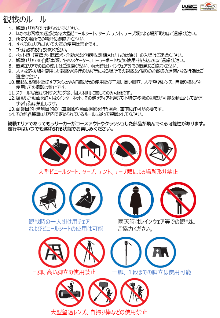 モータースポーツには危険が伴います。安全性の確保については必要な対策を施しておりますが、予想できない事故が発生する場合があります。これら発生しうるリスクのすべてについては自己責任となり、オーガナイザー、後援者、協力者、係員、ならびにラリージャパン実行委員会では一切の責任を負いませんのでご了承ください。