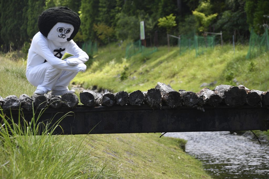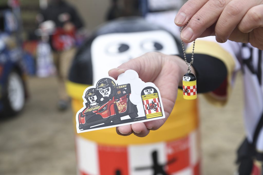 岡崎のスーパーSSでは、安全性を考えてコース上にバリアを置かねばならないという状況になっておりますが、赤白のウォーターバリアの中に、クッションドラムを配置し、そのクッションドラムをオカザえもん仕様にした、というわけです。