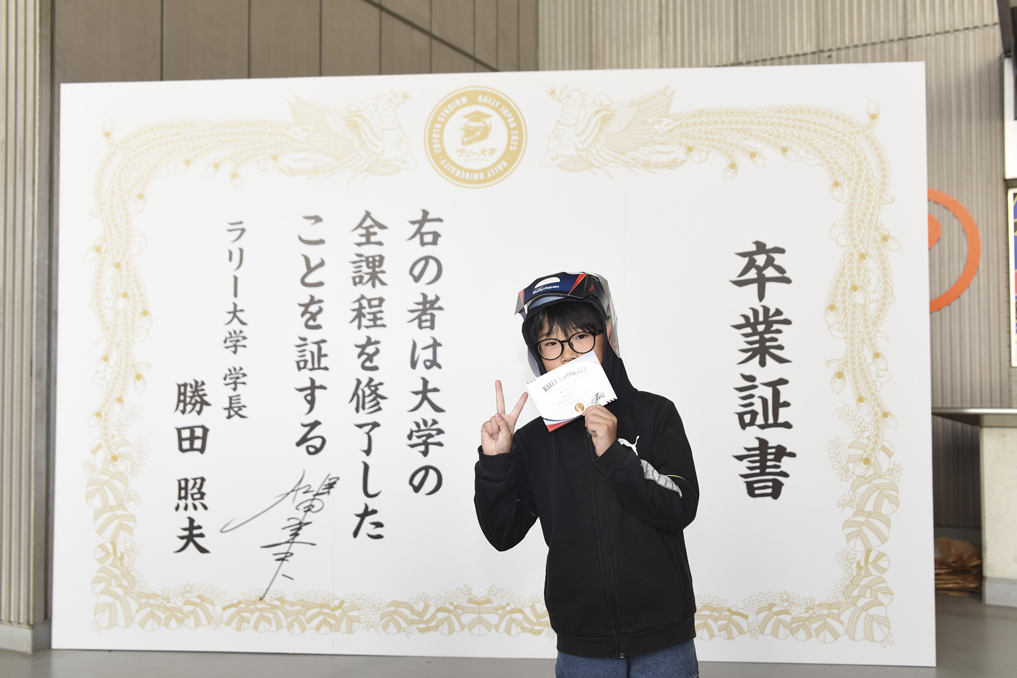 この大学、入学受付をすると「ラリー大学ノート(スタンプ台紙)」を受け取れます。基礎学部では全20問の設問に答えて「ペースノート」を作成、そしてドライビングシミュレーターや実車乗り込み体験、整備体験などを受講しながら、チェックポイントを回り単位を取得。そしてゴールへ戻ってくると、卒業証書と記念品もゲットできます。
