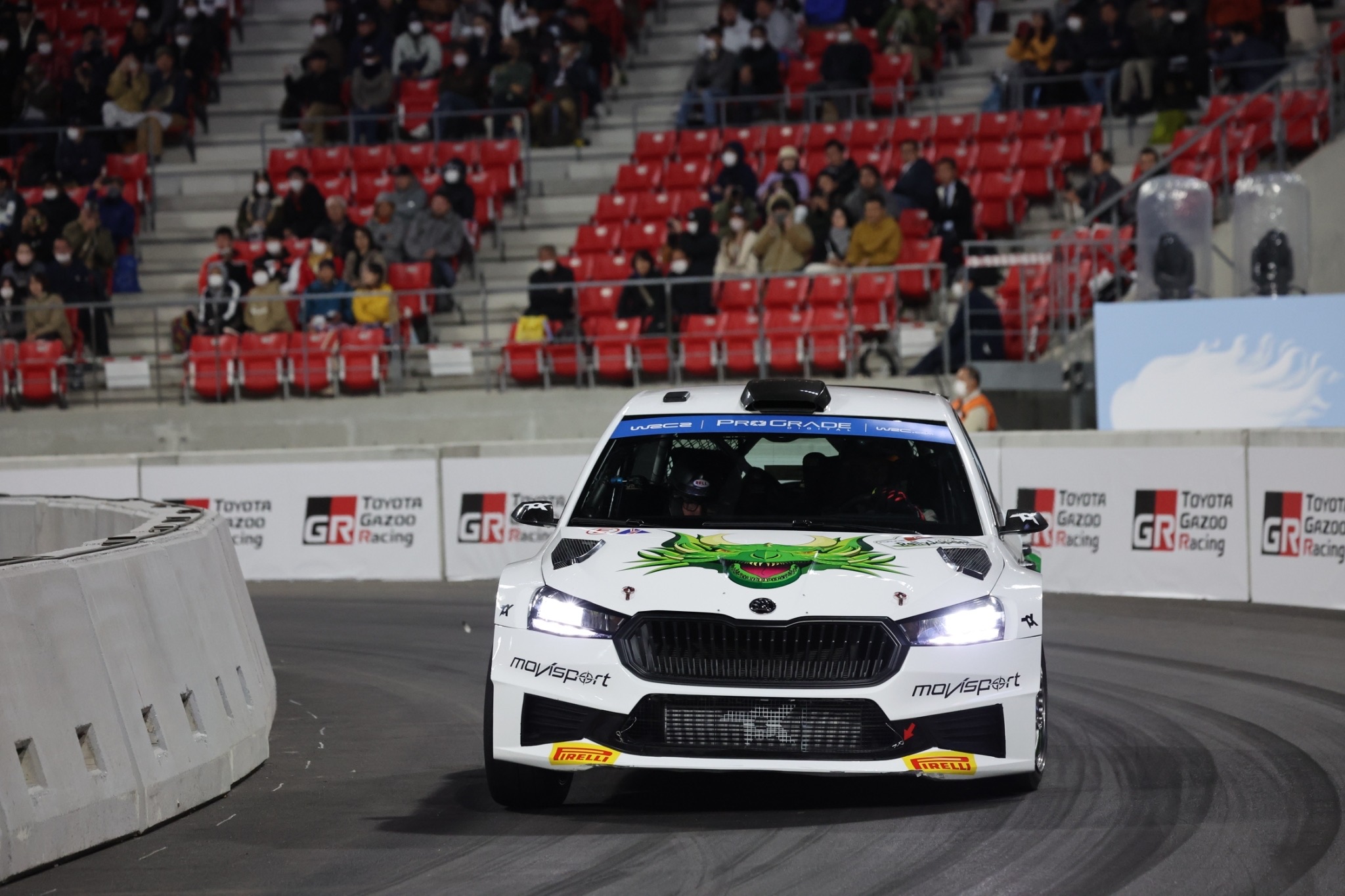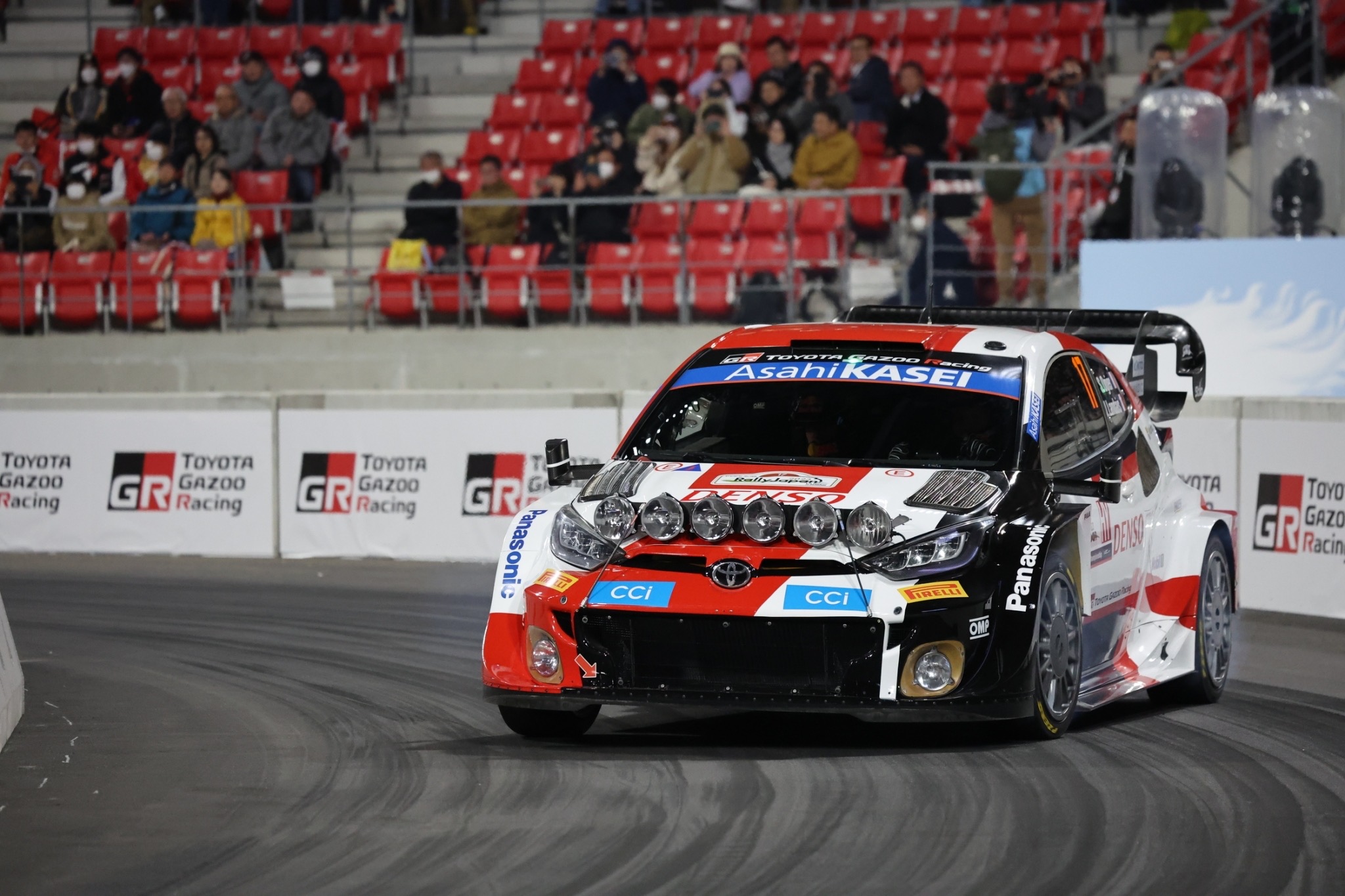 走行前のライトアップでムードも高まる中、TOYOTA GAZOO Racing WRTの勝田範彦選手のTOYOTA GR YARISとSUBARU TEAM ARAIの新井敏弘選手のSUBARU WRX S4の対決でSS1が始まりました。スタジアム内に設置された真新しい舗装でスピードも高く迫力ある走りを披露しました。