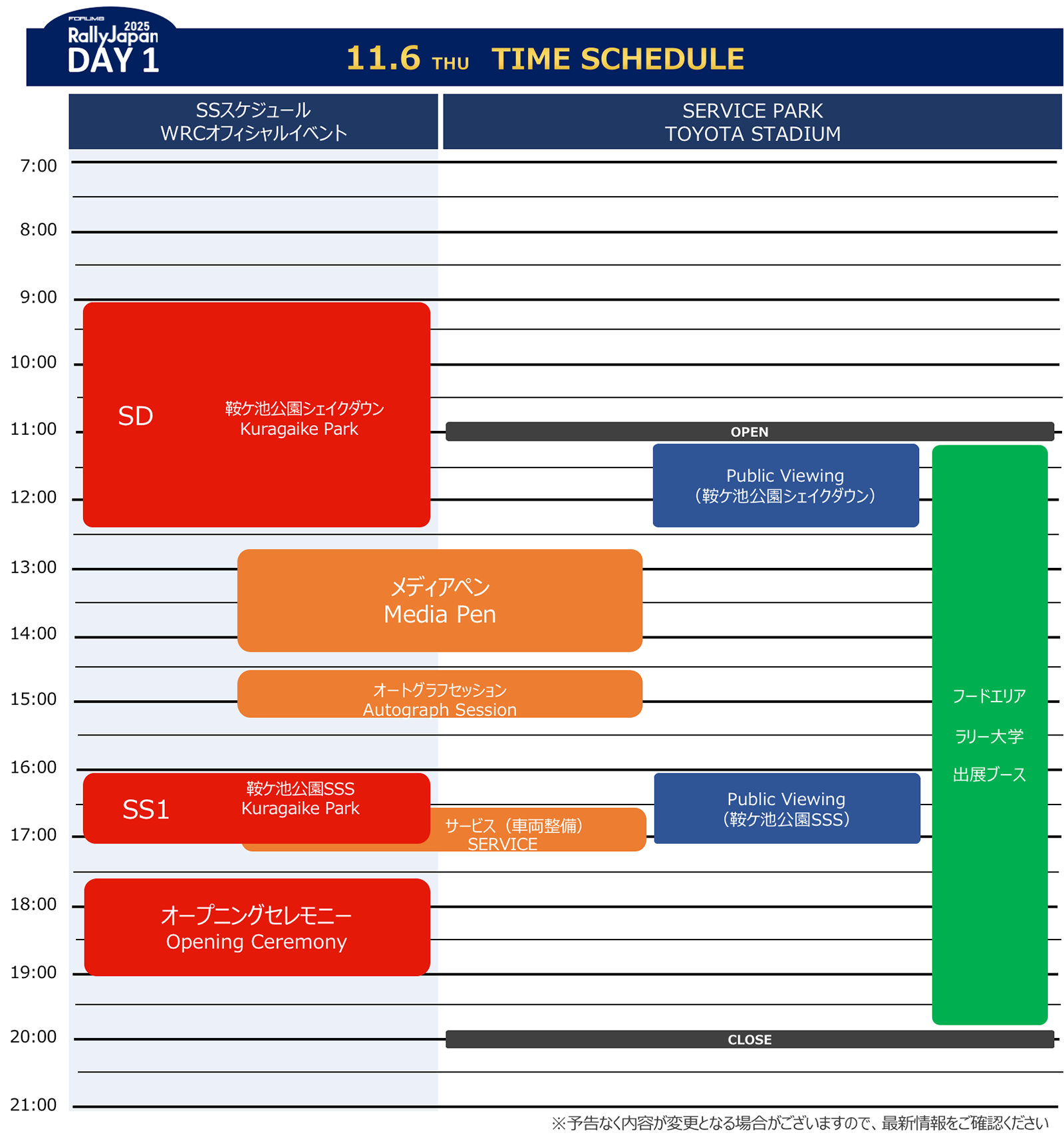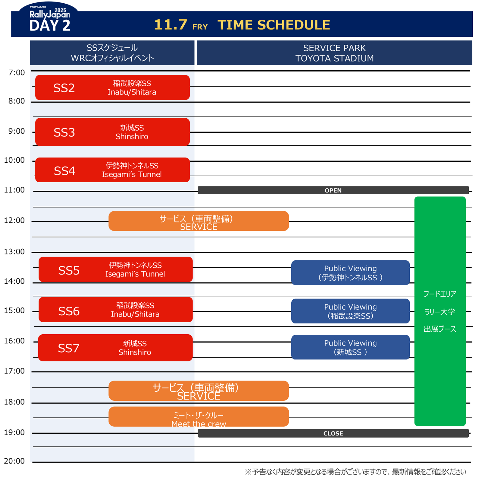 | 内容 | 開場時間内に開催される全SS のパブリックビューイングのほか、ステージイベントを実施予定です。 ※豊田スタジアムサービスパーク入場券が必要です。 |