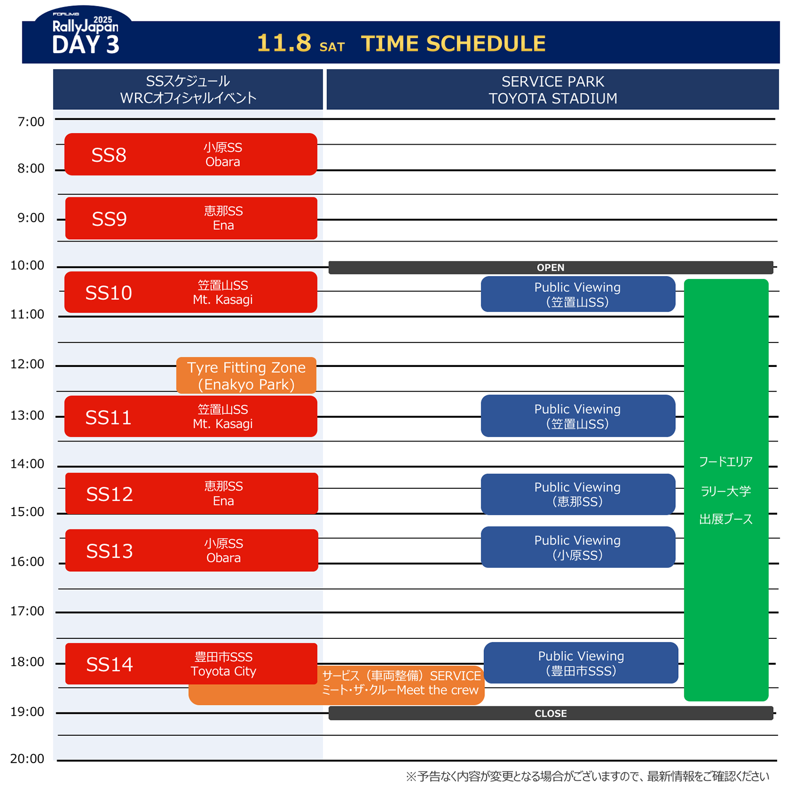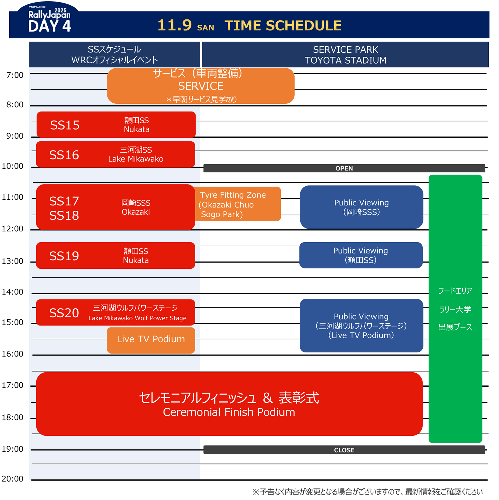 | 内容 | フォーラムエイト・ラリージャパン2025 のフィナーレとなるセレモニーと表彰式を行います。 ※11/9(日)の豊田スタジアムサービスパーク入場券が必要です。 |