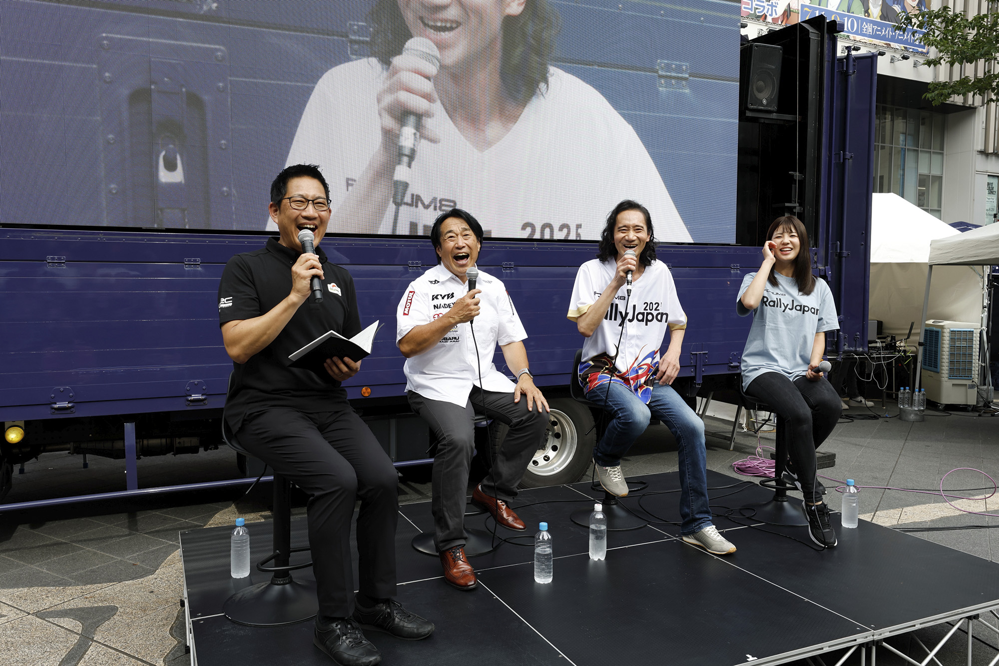ラリー期間中のエンターテーメント企画については、ラリーを体感しながら学べる「ラリー大学」などについてピエール北川さんから紹介されました。ここまでが概要発表会ですが、ここでゲストのラリードライバー新井敏弘さん、梅本まどかさんが登場し、ラリージャパンの魅力などを語るトークショーを行いました。新井さんは、「ヨーロッパのラリーと大きく異なるのは、コースの多くが常緑樹の生い茂る林道を走ること、美しい紅葉をバックにするリエゾンなども楽しめる」、と語り、梅本さんは、「新設の豊田市街地コースが楽しみです。夜間のステージということもあり、ドライバーのメンタルをコントロールしないといけないかな、と感じています」、とコ・ドライバーならではのコメントを残しています。その後、スペシャルゲストの声優・三木眞一郎さんが紹介され、トークショーに加わりました。大のクルマ好きとして知られる三木さんは、「ラリーは文字通り、ぶっ飛んでいますね。できれば、熱狂的なファンの皆さんと大声をあげながら観戦してみたいです」と語り、記者席からホーッという感嘆の声が漏れてきました。説明会ののち、トークショー出演者と会長・副会長が並ぶフォトセッションが中池袋公園で行われ、スティルカメラのフラッシュを浴び、TVカメラに向かってガッツポーズなどを披露していました。