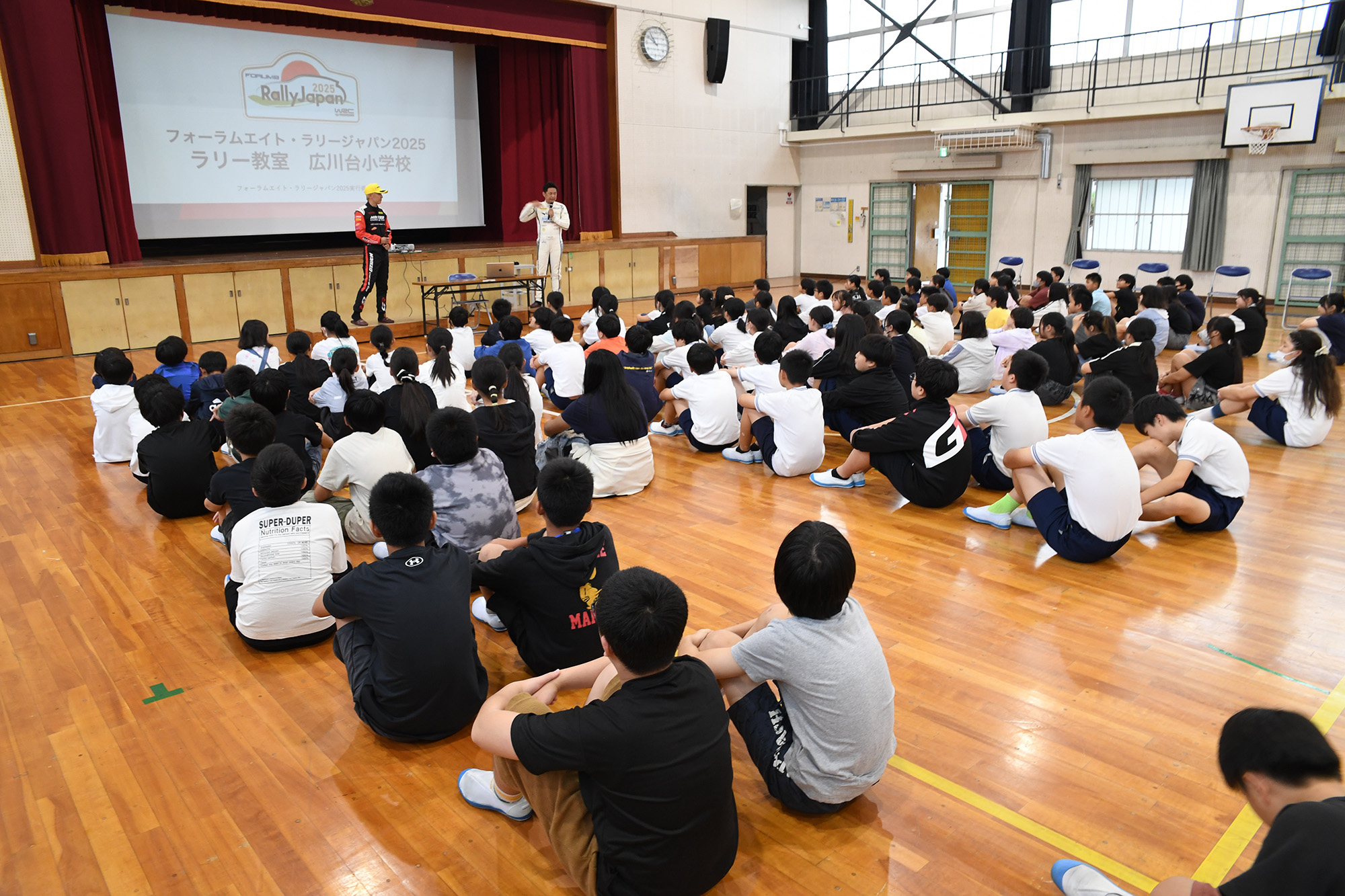 今回は、ドライバーの大竹直生選手とコ・ドライバーの安藤裕一選手の2名が講師としてラリー特別授業を体育館で行いました。ラリー競技についての説明や車両の解説、そしてラリーに参戦するクルーの役割や仕事についてなど、ラリーにまつわる講義が行われました。さらに持続可能な社会の実現に向けた取り組みや、ルールを守って交通安全に配慮し命を大切にするといった内容も講義の中で児童に伝えられました。講義の最後には児童たちからの質問の時間も設けられ、豊田スタジアム近くの小学校らしく、「競技中に事故をしたらどうなるの?」といった具体的な内容の質問も飛び出しますが、講師の2名は丁寧にわかりやすくそれらの質問に答えていました。