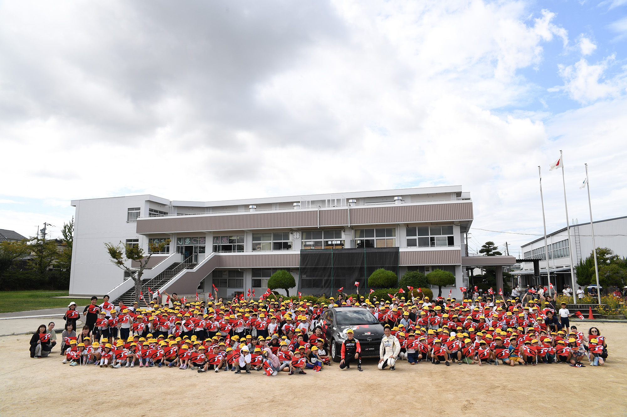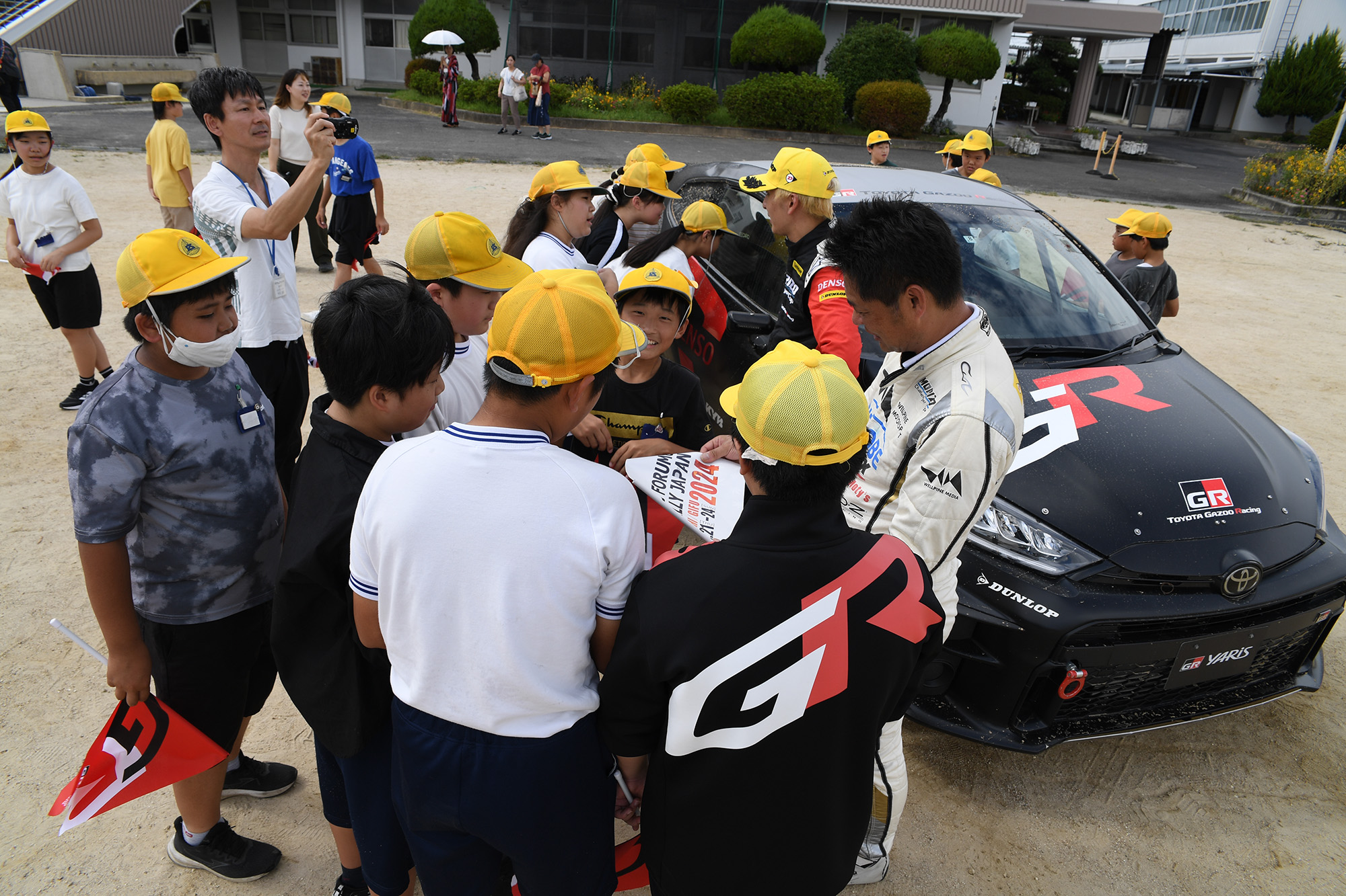 この4年ですでに30校以上で、このラリー教室は開催されていますが、今回の開催校は豊田スタジアムから直線距離で1kmほどと最も近い小学校のひとつ。多くの児童がリエゾン区間を走行するラリーカーを目撃したこともあり、ラリージャパンに対しての認知が極めて高い小学校である豊田市立広川台小学校です。