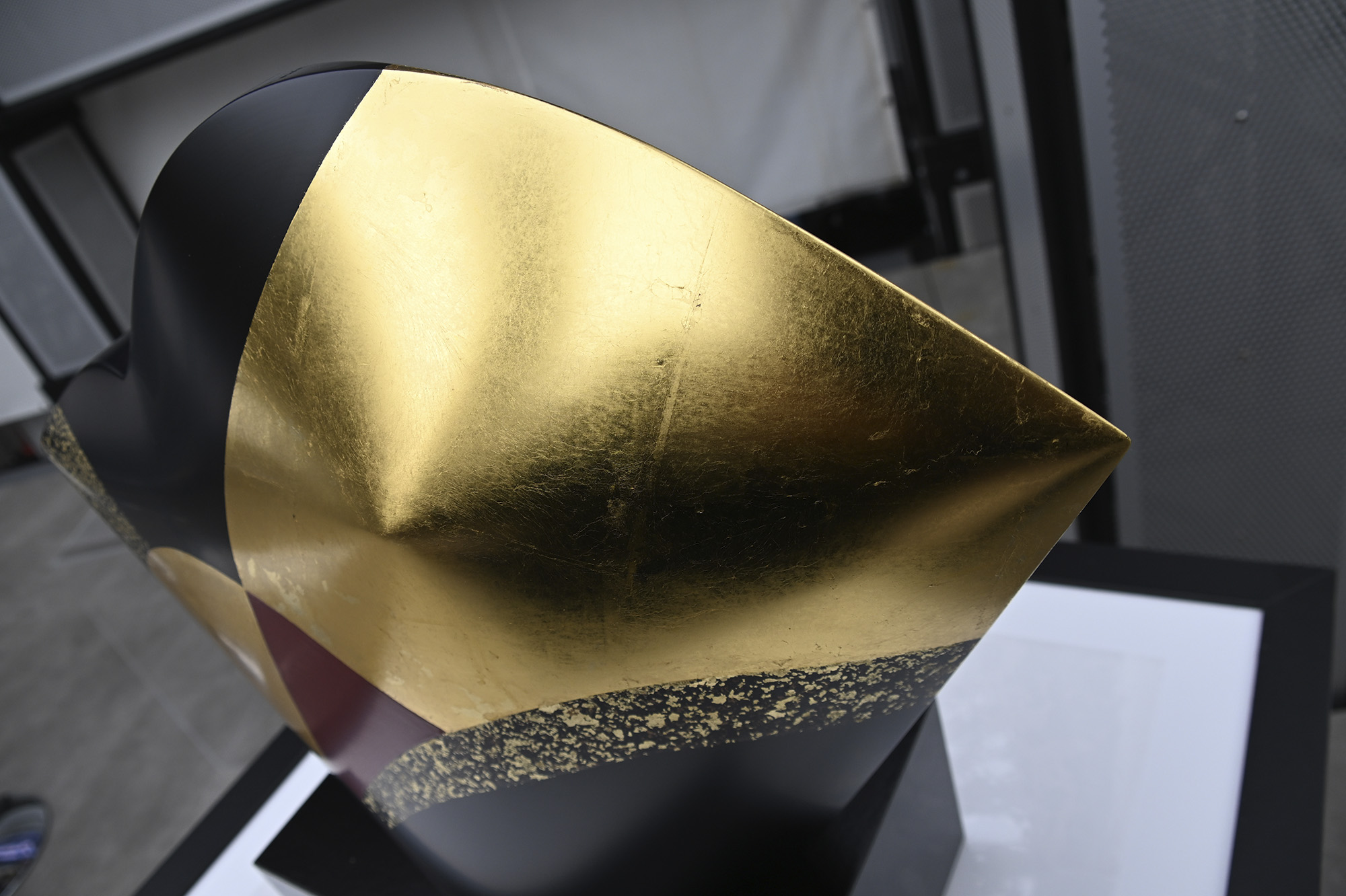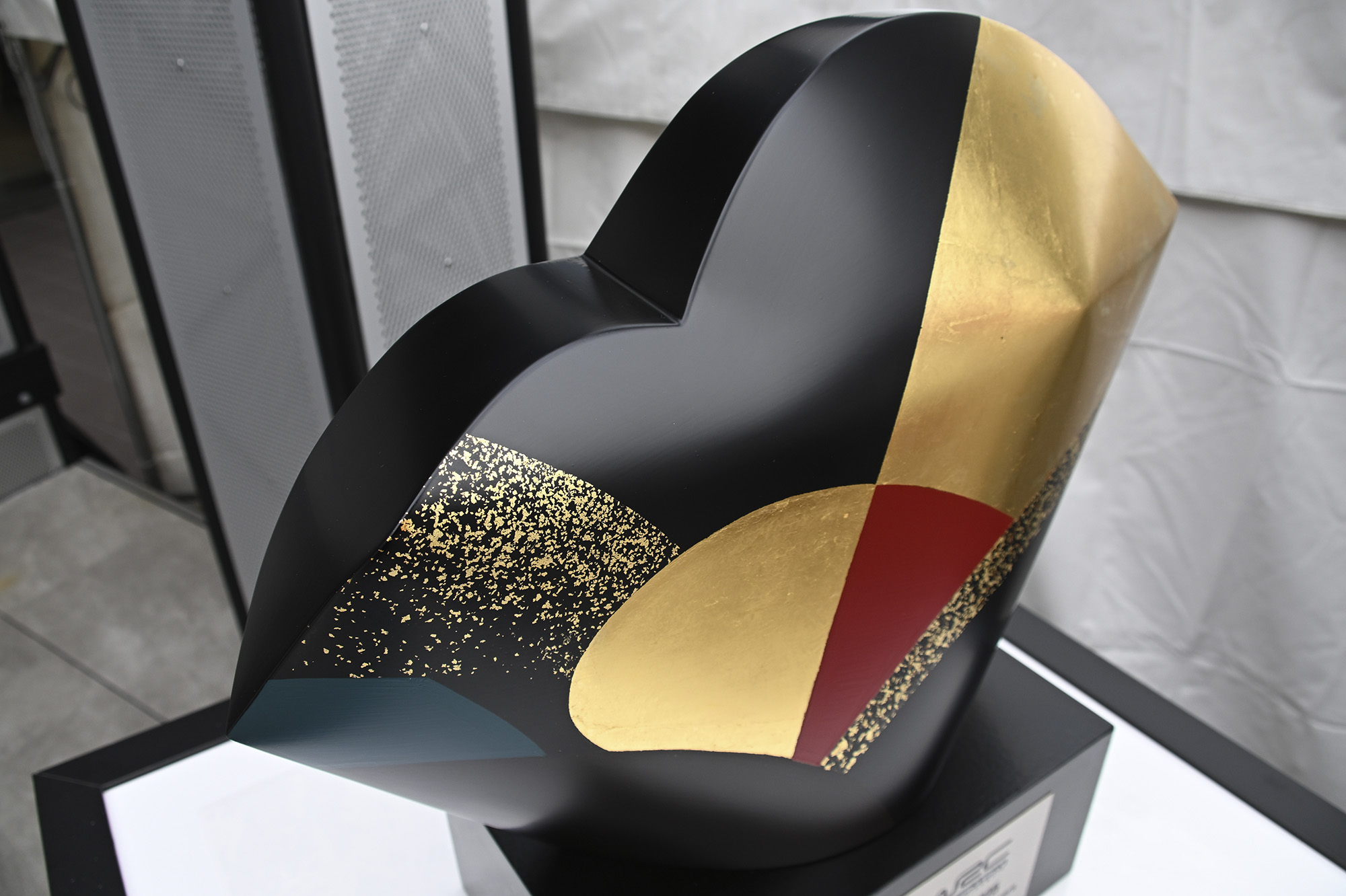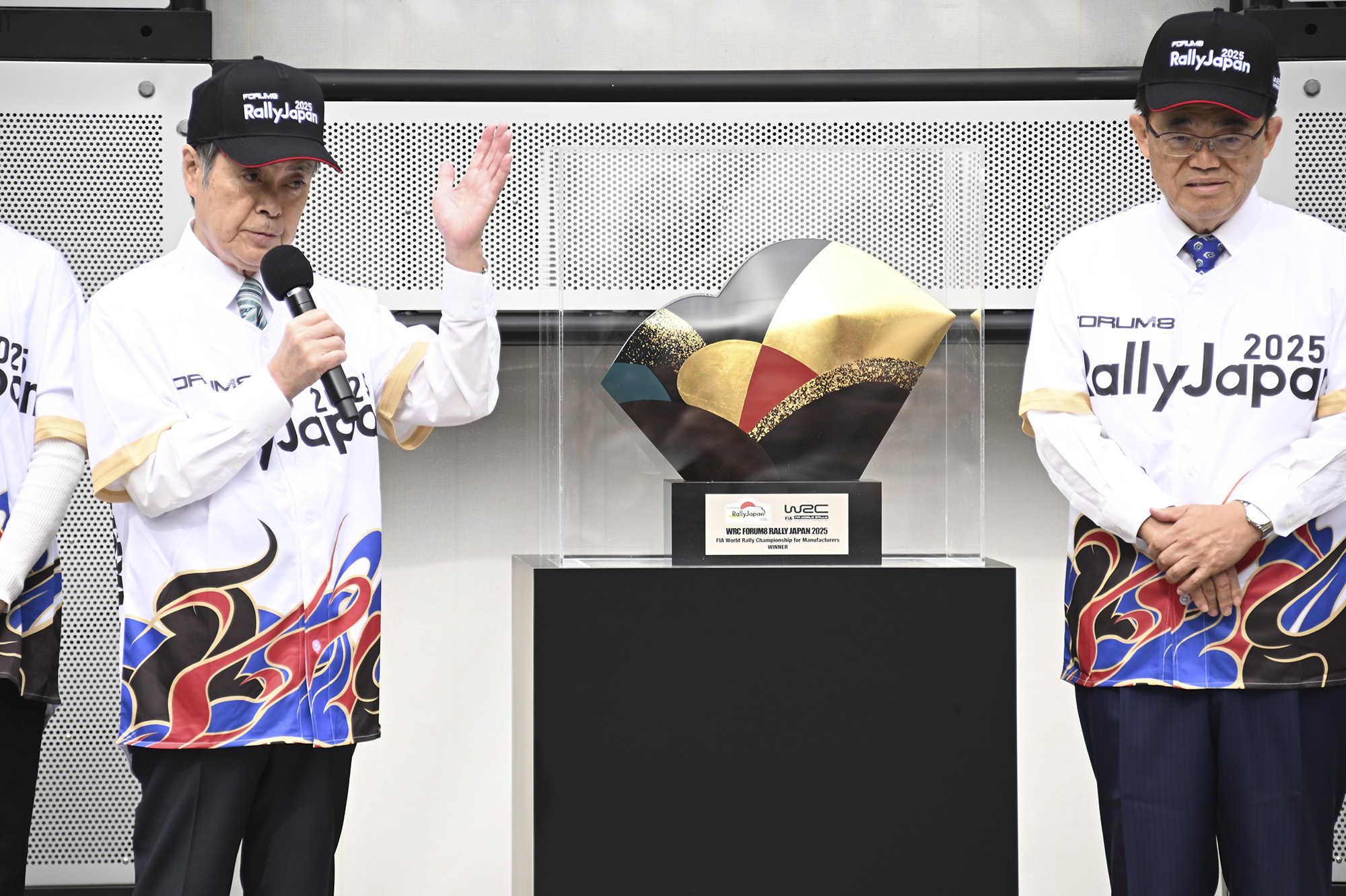 ラリージャパン実行委員会の太田稔彦会長と大村秀章愛知県知事、そして広沢一郎名古屋市長の3名によるアンヴェールで姿を現したトロフィーは、マニュファクチャラー用の優勝トロフィーで、昨年のトロフィとはまた形の異なりますが、昨年同様手の込んだ乾漆技法で作り上げられたものです。