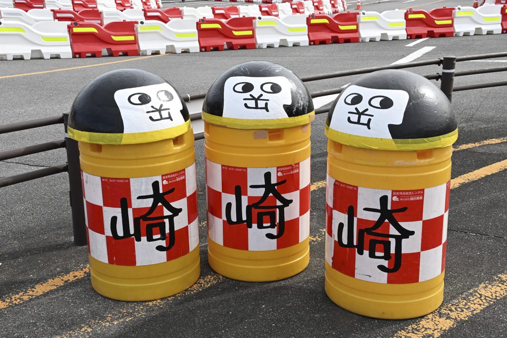 岡崎のスーパーSSでは、安全性を考えてコース上にバリアを置かねばならないという状況になっておりますが、赤白のウォーターバリアの中に、クッションドラムを配置し、そのクッションドラムをオカザえもん仕様にした、というわけです。