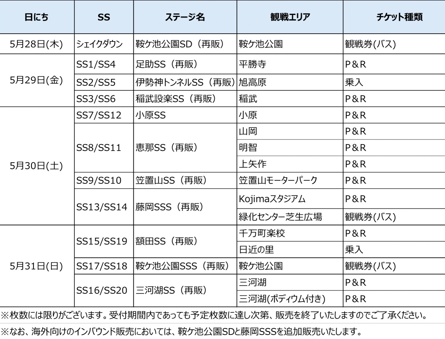 ラリージャパン2026実行委員会は、本年5月28日(木)~31日(日)に開催するFIA世界ラリー選手権(WRC)フォーラムエイト・ラリージャパン2026において、すでに完売となっている一部の観戦チケットについて、下記のとおり追加販売を行うことが決定しましたのでお知らせします。また、追加販売を含めた全体のチケット販売状況をお知らせします。