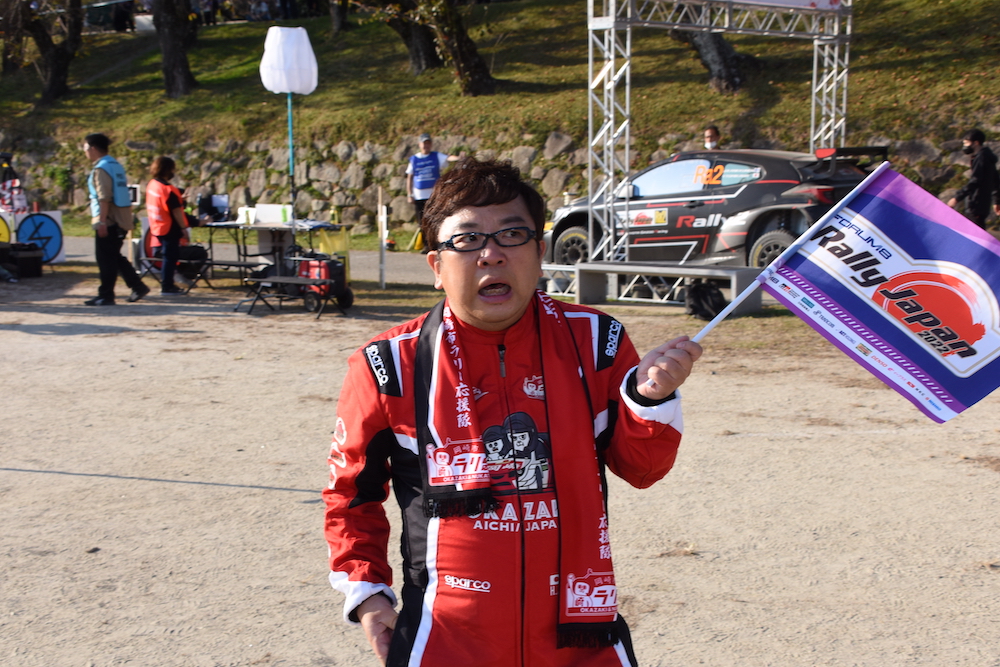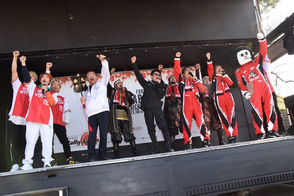 まず、大村秀章愛知県知事、中根康浩岡崎市長。さらにこの岡崎市の額田SSおよび岡崎SSSにゲスト解説として招かれたタレントの哀川 翔さん、そしてラリージャパンスペシャル応援団のSonar Pocket(ソナーポケット)も登壇してこの場に集まった多くのラリーファンに向けて挨拶、そしてトークショーが行われた。