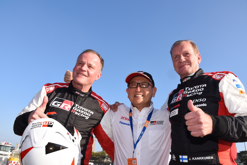 SS13の000カーがコースに入る直前に、この2台が岡崎スーパーSSを激走した。デモランを担当し、車両から降りてきたレジェンドドライバー2名はともに満面の笑みで、これを迎えたトヨタ自動車の豊田章男社長と、メディアの取材の対応に快く応じていた。