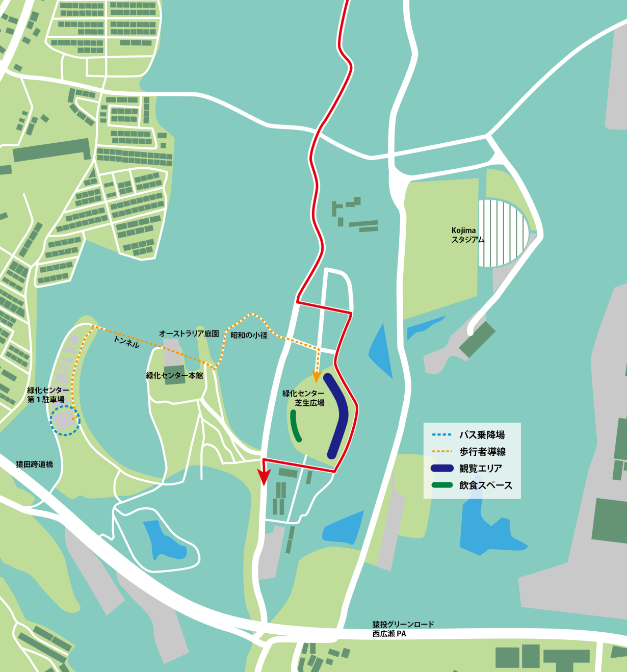 Google Map・この観戦エリアには、自家用車での入場はできません。指定の駐車場から発着するシャトルバスをご利用いただきます。